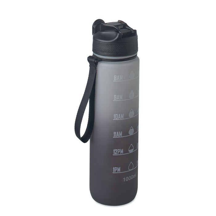 RPET-muovista valmistettu urheiluvesipullo, jossa on integroitu olki, pehmeä silikoninen suukappale, motivoiva aikamerkintä, yhdellä kädellä avattava kääntyvä kansi, turvalukko ja kantohihna.