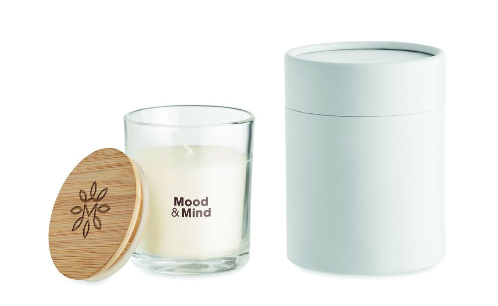 Vaniljan tuoksuinen vaha kynttilä lasilyhdyssä bambu kannella, pakattuna paperiseen lahjapakkaukseen.