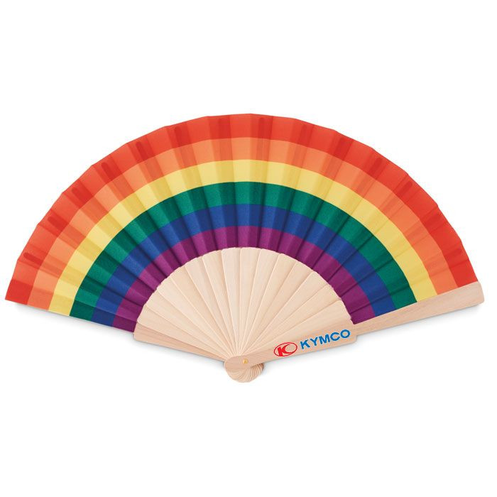 Manuaalinen polyesteeristä valmistettu satenkaaren värein koristeltu viuhka.