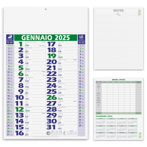 Monthly calendar 12 sheets of 70 gr coated paper with heat-sealed header, international holidays and notes page printed on the back. Expense memo on the last page