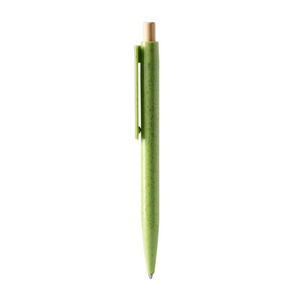Ballpoint pen with wheat fiber body, click mechanism, bamboo button. Wide clip ideal for customization. Blue ink.