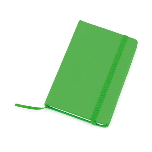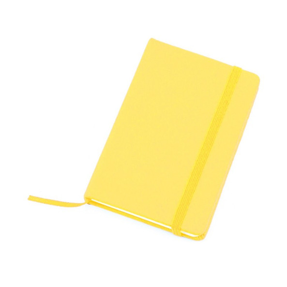 A5 notebook with hardcover in PU. 100 lined sheets, elastic band and matching colour fabric bookmark.