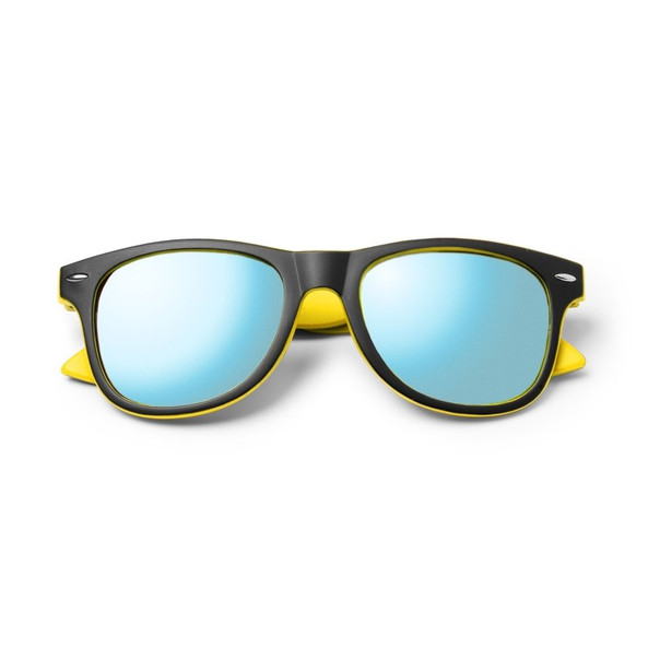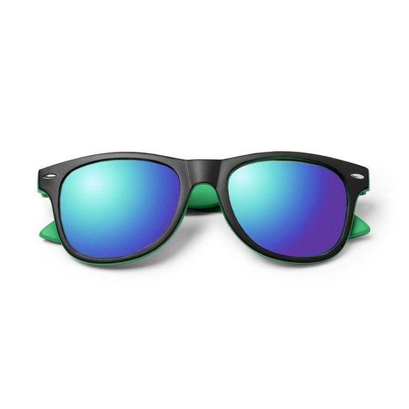 Sunglasses with UV400 protection of classic design. Bicolor frame finish in fun colors and matching color mirrored lenses.