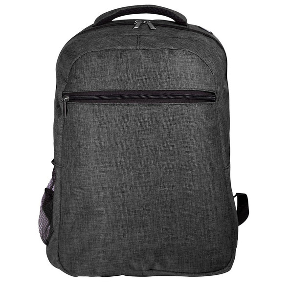 Backpack in 600D polyester melange effect. Large main compartment with zip closure, front zip pocket, earphone loop, matching colored padded top handle, side mesh pocket, adjustable shoulder straps.