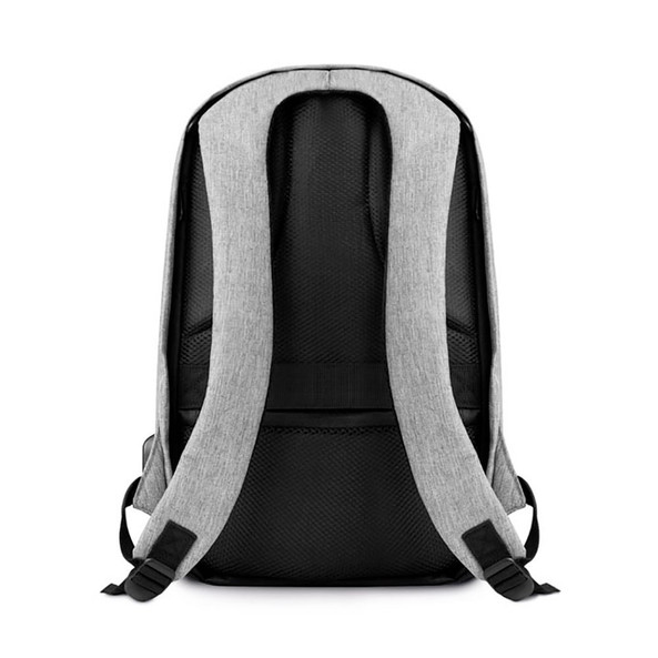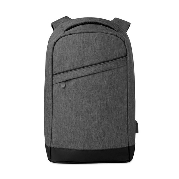 Laptop backpack in 600D polyester melange finish, large main compartment with internal padded compartment suitable for 13" laptop, internal zip pocket, two internal open compartments. Front oblique pocket with zip closure. USB port to charge your device (powerbank not included , cord included.) Concealed zip pockets on back for theft protection.