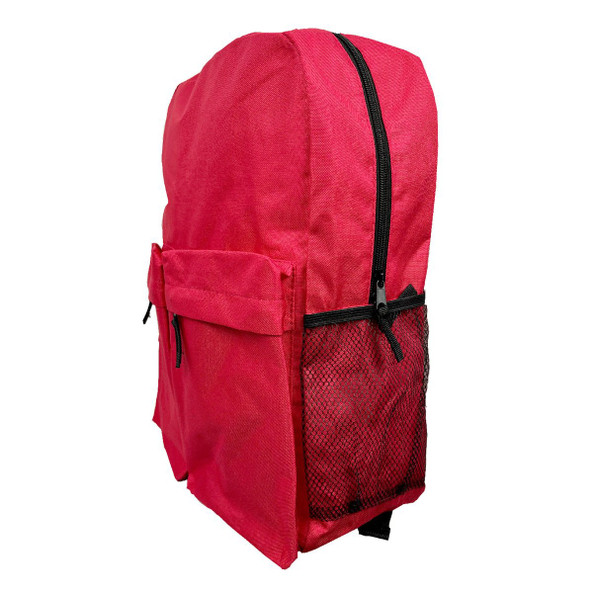 Polyester 600D backpack, large main compartment with zip closure, two front zip pockets. Two mesh side pockets. Back strap to attach it to a trolley. Adjustable shoulder straps. Top handle.