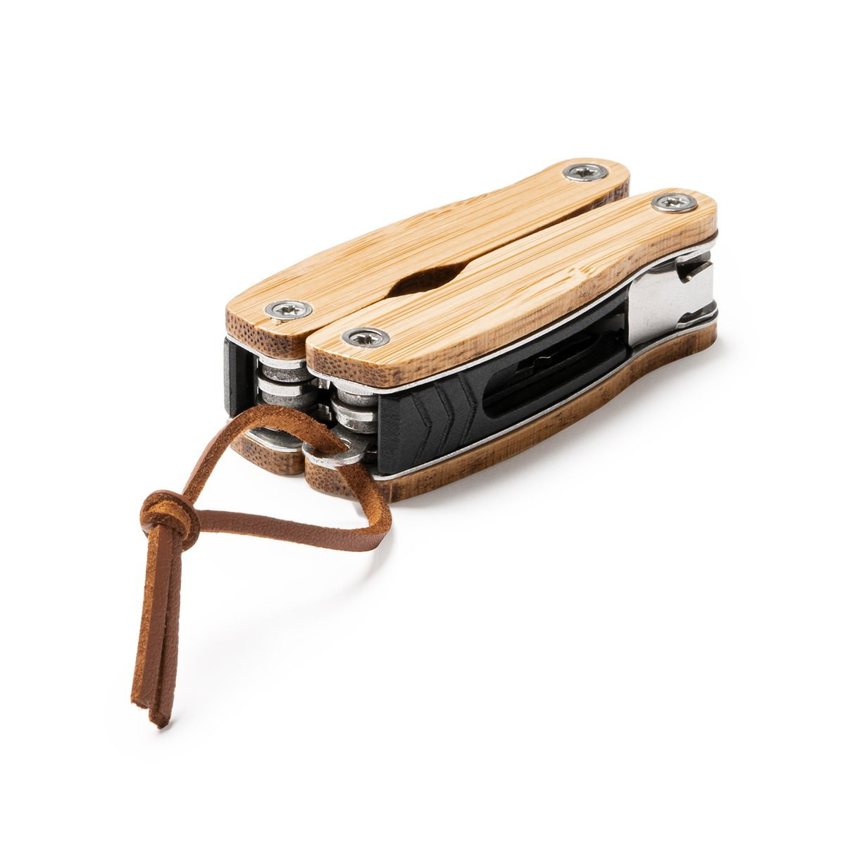 Multi-tool with resistant stainless steel body and bamboo handle, 12 functions. Includes knives and blades; screwdrivers, files; openers and pliers. With PU leather carrying strap and presented in an individual box