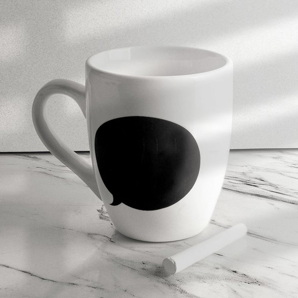 White ceramics mug with a black bubble on its front and a white chalk to paint on it. It has a capacity of 250ml. Presented in an individual box.