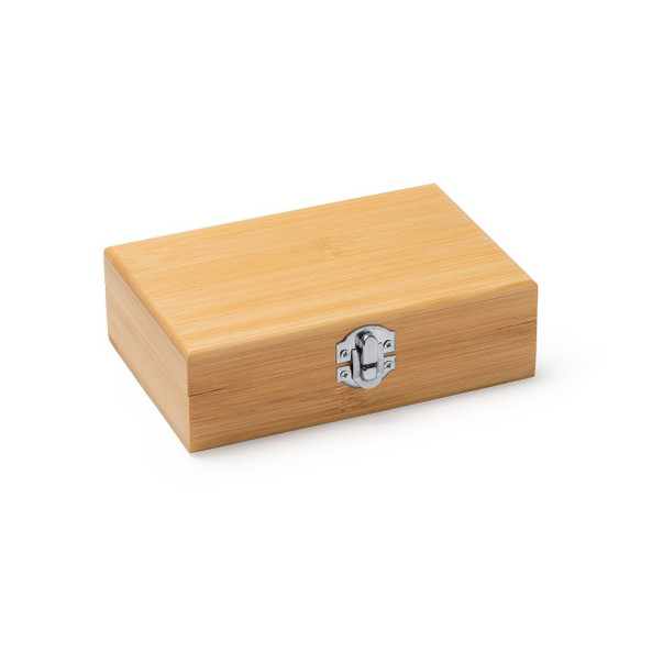 Wine set with stainless steel accessories and bamboo details, corkscrew with capsule cutter, stopper and drop stopper. Supplied in bamboo packaging with a contoured interior.