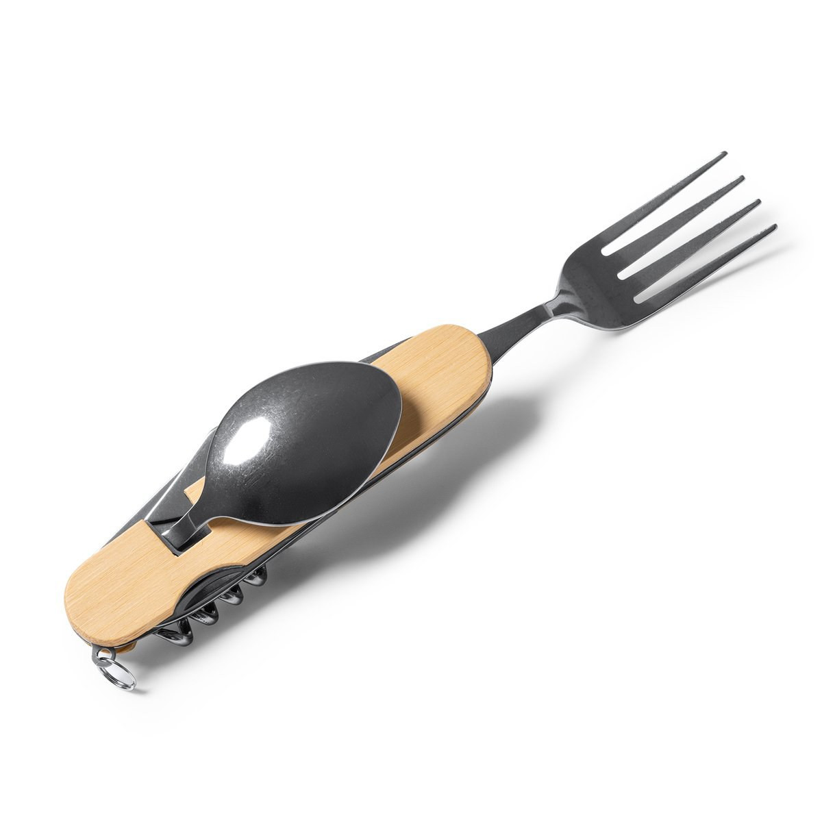 Multi-purpose stainless steel cutlery set with bamboo handles. Fork with corkscrew function and spoon with small knife. Provided in an eco-designed packaging.