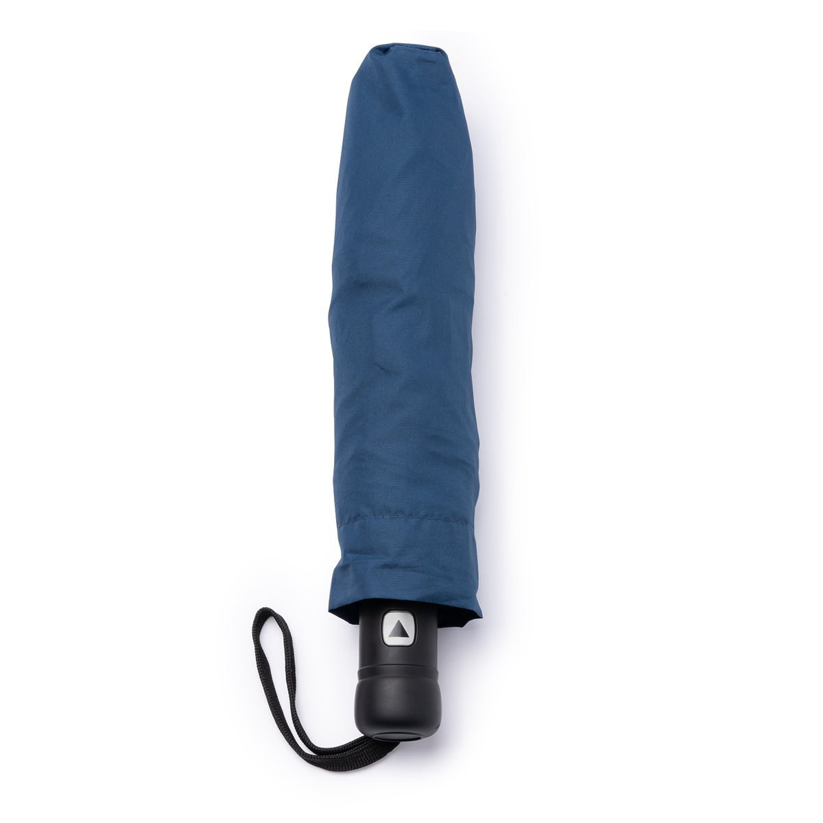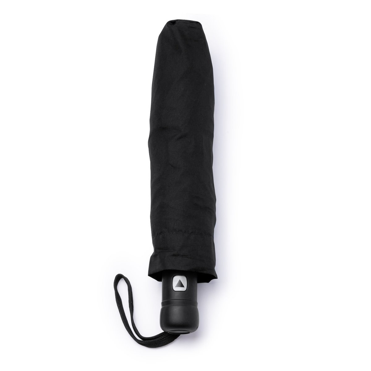 2 section folding umbrella in RPET, 190T pongee fabric and reflective bands. Fiberglass structure with windproof system. Automatic opening. Velcro closure. Coordinated colored pouch.