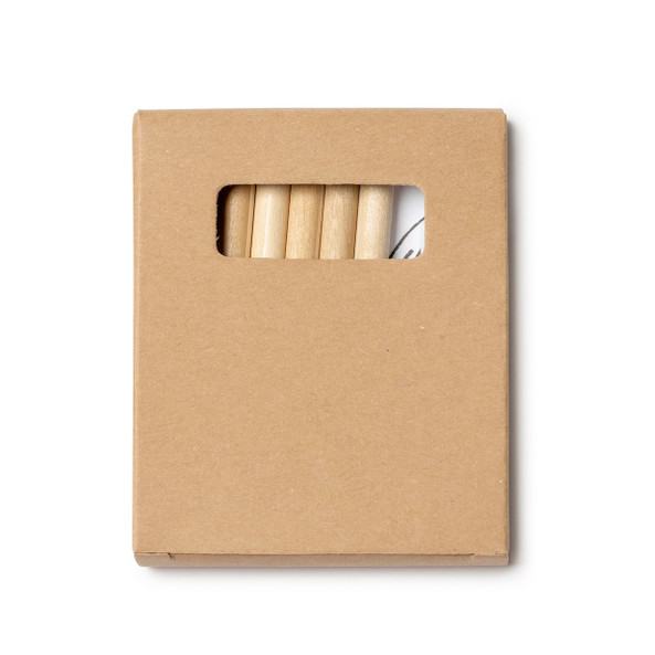 Set of 8 pieces in natural finish cardboard box with window. Includes pad with coloring drawings, pencil sharpener and 6 wooden pencils with cylindrical body and mines in varied colors.