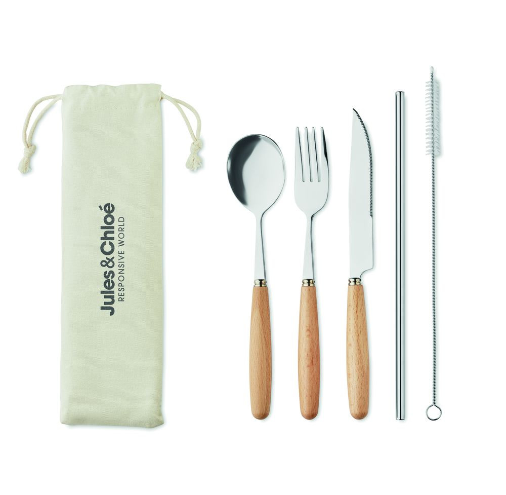 Sisältää veitsen, haarukan, lusikan, pillin ja harjan pillin puhdistamiseen.