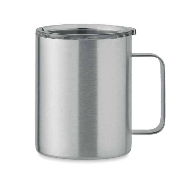 Kaksiseinäinen kierrätetystä ruostumattomasta teräksestä (90 % kierrätettyä ruostumatonta terästä ja 10 % ruostumatonta terästä) valmistettu muki, jossa on liukuva juoma-aukon kansi.