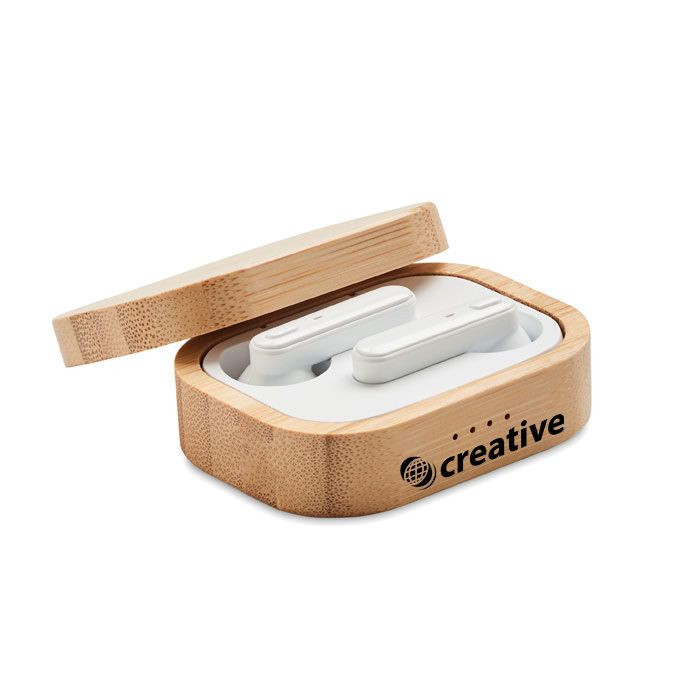 True Wireless Stereo (TWS) 5.0 -kuulokkeet bambukotelossa, jossa on sisäänrakennettu 30 mAh akku.