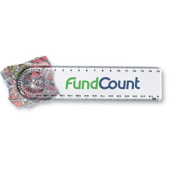 15 sentin muovi viivain, suurennuslasilla ja astelevyllä.