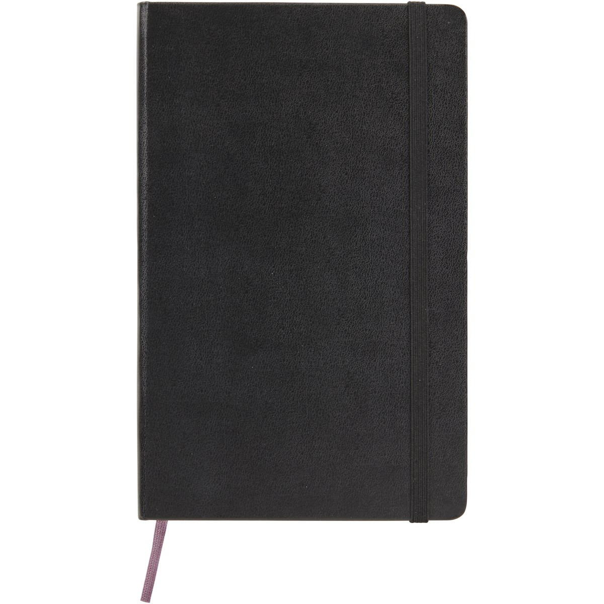 Suosittu musta Moleskinen kovakantinen Classic-muistikirja koossa L. Saatavilla myös muita värivaihtoehtoja. Pyöristetyt kulmat, elastinen suljin ja kirjanmerkkinaru. Takakannessa kartonkinen avautuva tasku, jossa on kangaspinta. 240 norsunluunväristä pisteviivoitettua sivua.