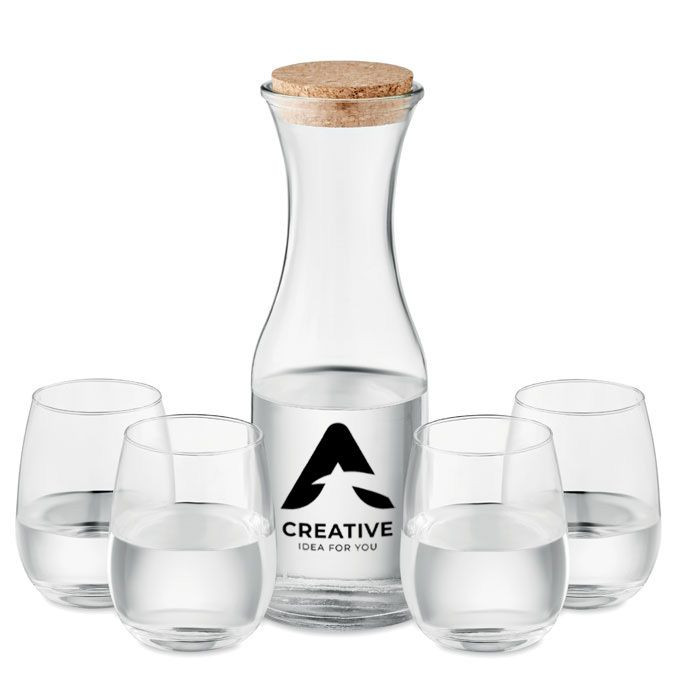 Kierrätetystä lasista valmistettu litran karahvi korkki kannella ja 4x 420 ml juomalasia.