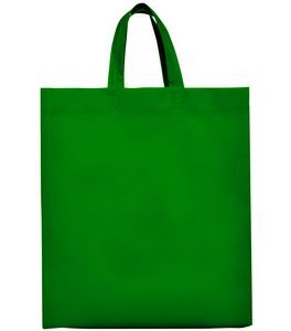 Heat-sealed bag with gusset on the sides and base, and matching short handles, made of non-woven fabric.
