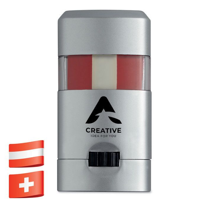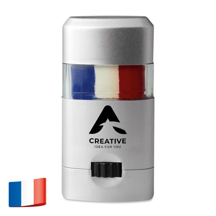 Kasvomaali hopeanvärisessä kotelossa.